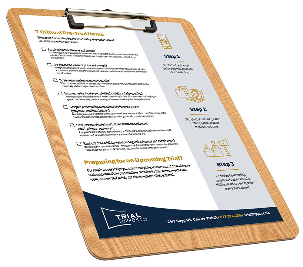 We collect all trial data, prepare custom graphics, produce depo clips, and more.